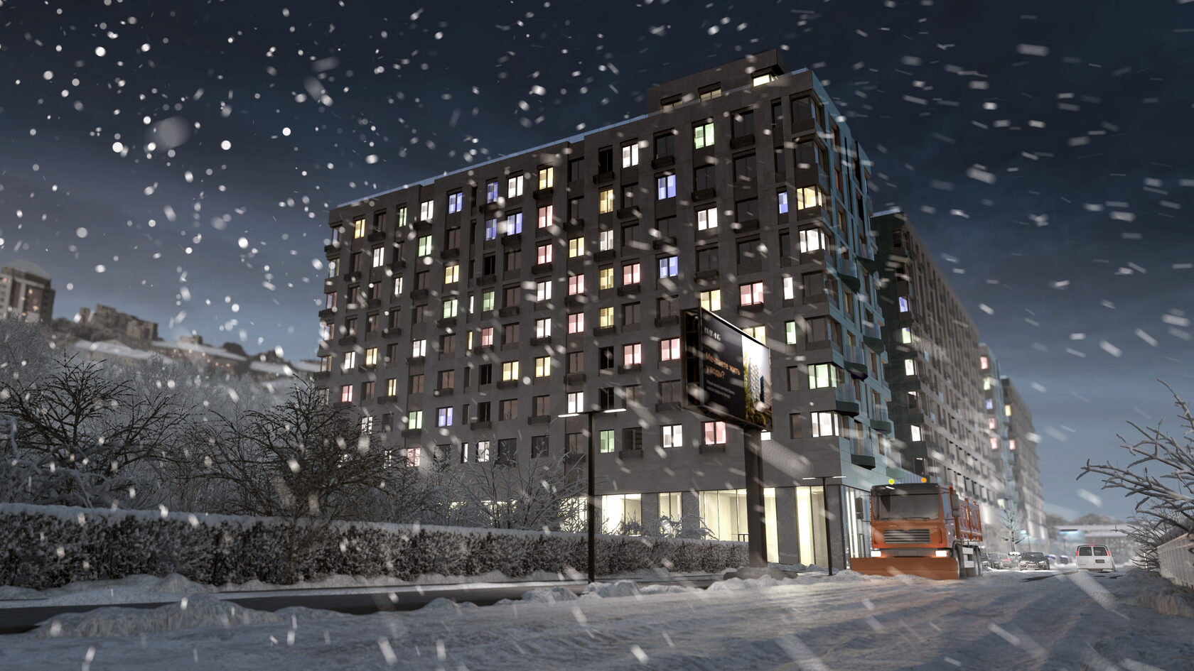 В самом разгаре монтаж окон, готовность уже 60%. Также на 60% завершены внутренние инженерные сети. Отделочные работы внутри зданий будут выполнятся в 2026 году, сегодня степень готовности 30%. Начат монтаж кассет из алюмокомпозита, завершены работы по монтажу электросетей фасадного освещения.