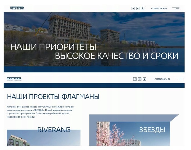 ГОРСТРОЙ заявляет, что строит то, что обещает. Подтверждение этому – слайдер, где можно сравнить рендеры и готовый объект на примере жилого комплекса «Скандинавия» на Дальневосточной. Все смыслы и принципы компании на главной странице как на ладони. «Наши приоритеты – высокое качество и сроки», «Создаем образ жизни,сохраняем ценности», «Наша репутация – ваше доверие». Никаких подделок и заискиваний – даже визуал создан на основе реальных фотографий. Розовая сирень, например, результат озеленения жилого комплекса «Скандинавия». Этим ГОРСТРОЙ будто говорит: «Мы честны, нам можно доверять».